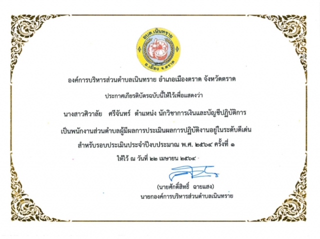 โครงการเชิดชูเกียรติพนักงานส่วนตำบลผู้มีผลการปฏิบัติงานดีเด่น ประจำปีงบประมาณ พ.ศ. 2564 ตามโครงการส่งเสริมคุณธรรมและจริยธรรม