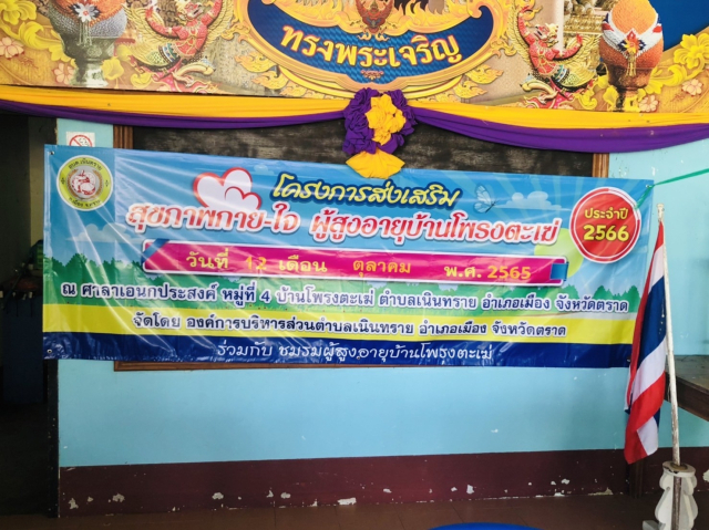 องค์การบริหารส่วนตำบลเนินทรายร่วมกับชมรมผู้สูงอายุบ้านโพรงตะเฆ่ จัดกิจกรรมตามโครงการส่งเสริมสุขภาพกาย-ใจ ผู้สูงอายุบ้านโพรงตะเฆ่ ประจำปี 2566 (เดือนตุลาคม 2565) เมื่อวันที่ 12 ตุลาคม 2565 ณ ศาลาเอนกประสงค์ หมู่ที่ 4 บ้านโพรงตะเฆ่ ตำบลเนินทราย อำเภอเมืองตราด จังหวัดตราด