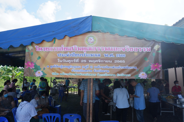 องค์การบริหารส่วนตำบลเนินทราย จัดทำโครงการส่งเสริมคุณธรรมและจริยธรรม ประจำปีงบประมาณ พ.ศ. 2566 โดยจัดกิจกรรม ทำบุญถวายภัตตาหารเพลแด่พระสงฆ์ การบรรยายธรรม การฝึกปฏิบัติธรรม การบริหารจิต เจริญปัญญา ณ ศูนย์เรียนรู้เศรษฐกิจชุมชน (หมู่ที่ 6) องค์การบริหารส่วนตำบลเนินทราย อำเภอเมืองตราด จังหวัดตราด เมื่อวันที่ 25 พฤศจิกายน 2565