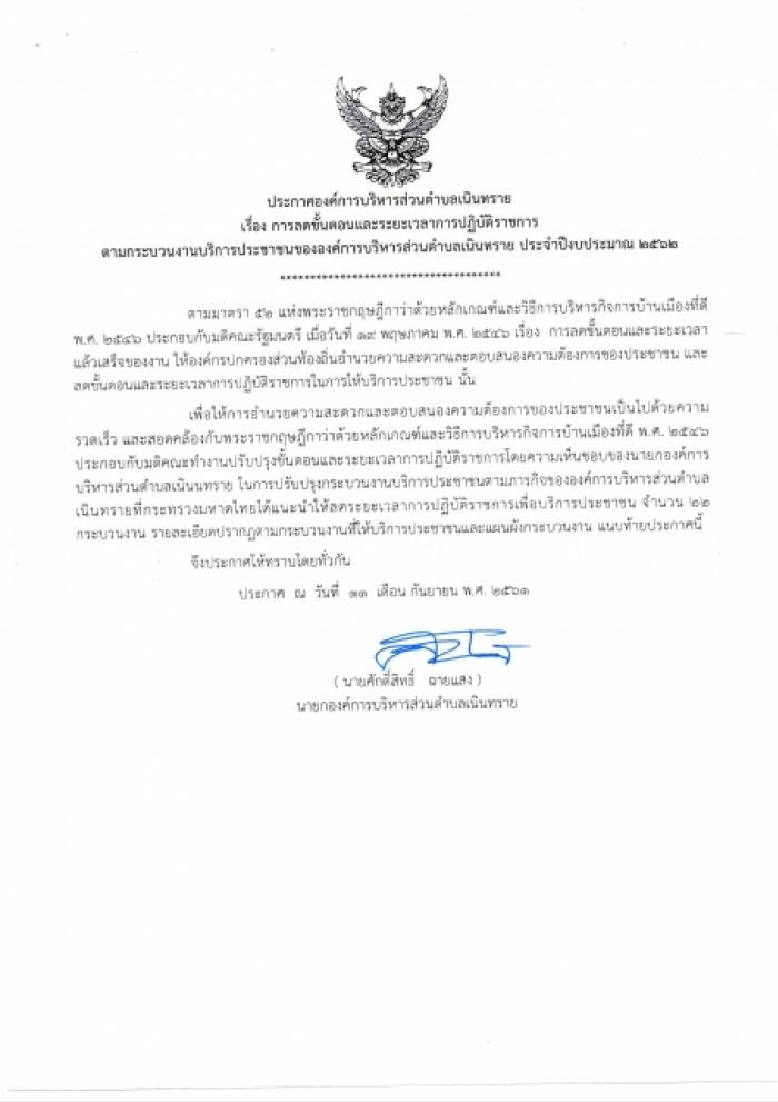 ประกาศองค์การบริหารส่วนตำบลเนินทราย เรื่อง การลดขั้นตอนและระยะเวลาการปฏิบัติราชการตามกระบวนงานบริการประชาชนขององค์การบริหารส่วนตำบลเนินทราย ประจำปีงบประมาณ 2562