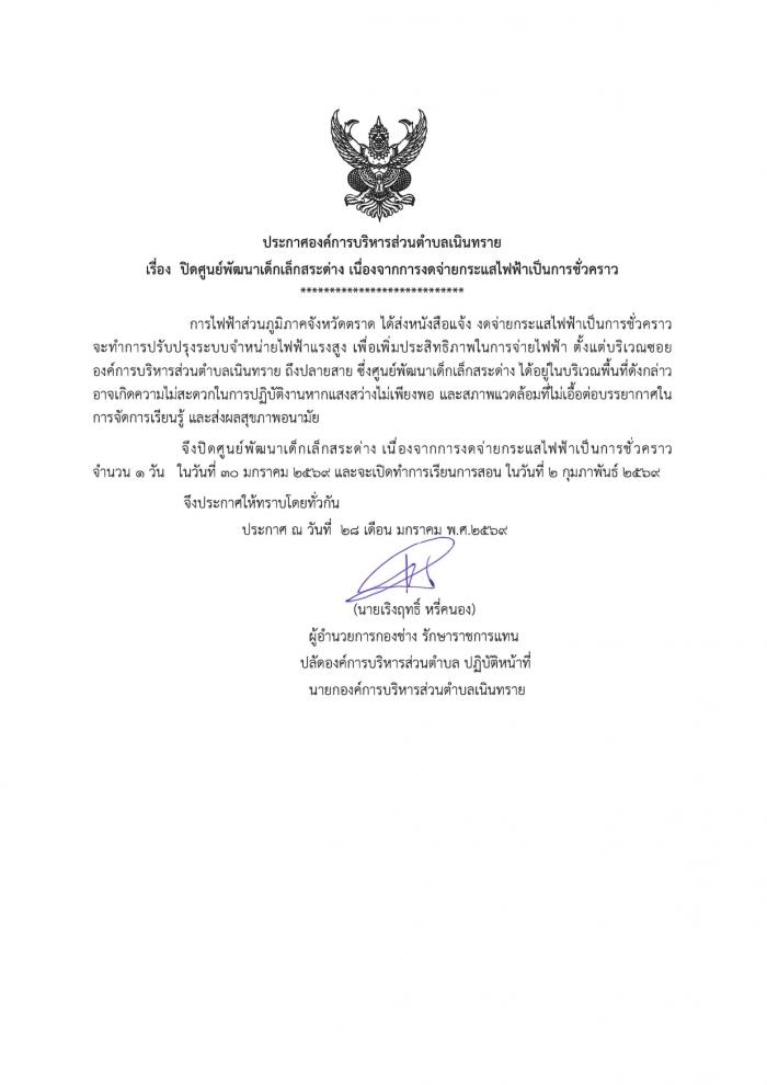 งานการศึกษา ประกาศ ปิดศูนย์พัฒนาเด็กเล็กสระด่าง เนื่องจากการงดจ่ายกระแสไฟฟ้าเป็นการชั่วคราว