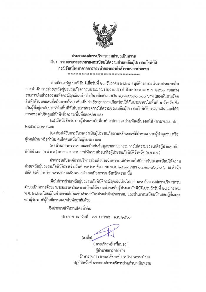 ข่าวประชาสัมพันธ์ ขยายระยะเวลาลงทะเบียนให้ความช่วยเหลือผู้ประสบภัยพิบัติกรณีอันเนื่องมาจากการกระทำของกองกำลังจากนอกประเทศ