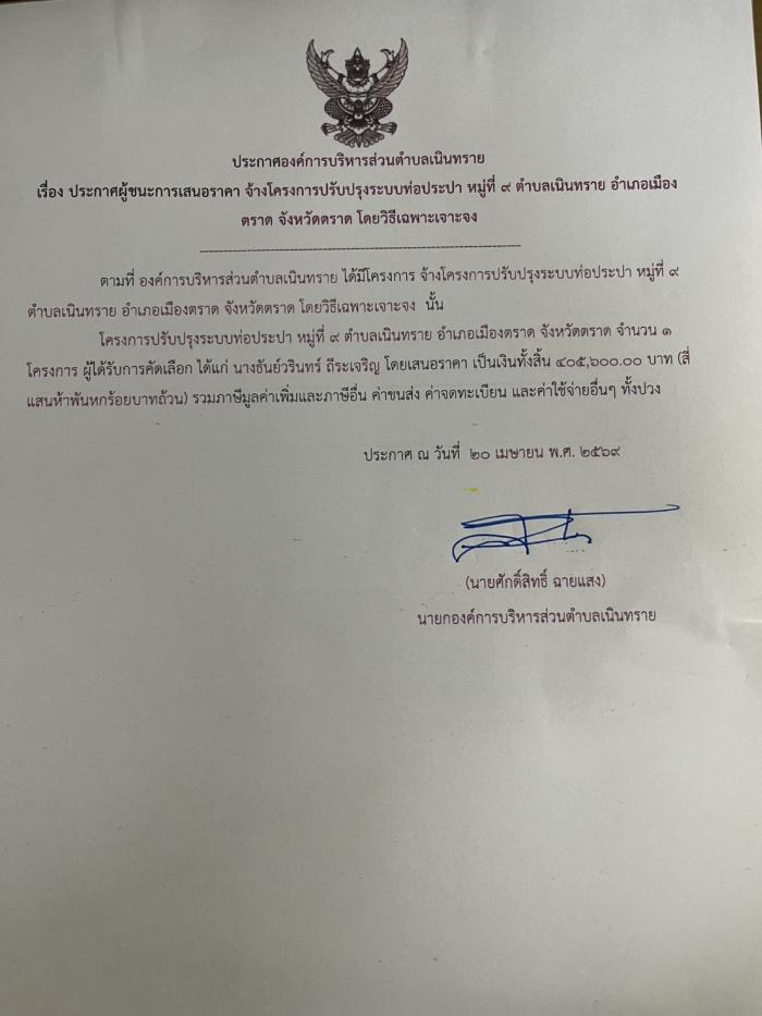 ประกาศต่าง ๆ เกี่ยวกับการจัดซื้อจัดจ้างหรือการจัดหาพัสดุ ประกาศผู้ชนะการเสนอราคาจ้างโครงการปรับปรุงระบบท่อประปา หมู่ที่ 9 ตำบลเนินทราย อำเภอเมืองตราด จังหวัดตราด