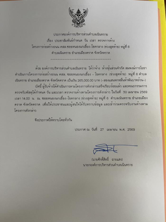 ประกาศต่าง ๆ เกี่ยวกับการจัดซื้อจัดจ้างหรือการจัดหาพัสดุ ประชาสัมพันธ์กำหนด วัน เวลา ตรวจการจ้างโครงการก่อสร้างถนน คสล.ซอยหนองนกเอี้ยง-โขดกลาง (ช่วงสุดท้าย) หมู่ที่ 6 ตำบลเนินทราย อำเภอเมืองตราด จังหวัดตราด