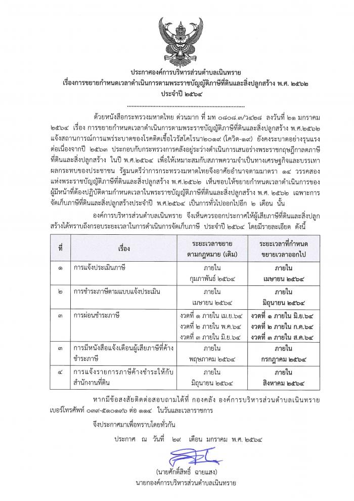 ข่าวประชาสัมพันธ์ ประกาศองค์การบริหารส่วนตำบลเนินทราย เรื่องการขยายกำหนดเวลาดำเนินการตามพระราชบัญญัติภาษีที่ดินและสิ่งปลูกสร้าง พ.ศ. ๒๕๖๒ ประจำปี ๒๕๖๔