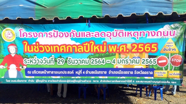 องค์การบริหารส่วนตำบลเนินทราย ร่วมกับกำนัน ผู้ใหญ่บ้าน สารวัตรกำนันและผู้ช่วยผู้ใหญ่บ้าน ตำรวจ ทหาร สำนักจัดการทรัพยากรป่าไม้ที่ 9 และสมาคมสว่างบุญช่วยเหลือ ฯลฯ จัดตั้งจุดบริการประชาชน ตามโครงการป้องกันและลดอุบัติเหตุทางถนนในช่วงเทศกาลปีใหม่ พ.ศ. 2565 ระหว่างวันที่ 29 ธันวาคม 2564 - 4 มกราคม 2565 ณ บริเวณหน้าศาลาอเนกประสงค์ หมู่ที่ 4 ตำบลเนินทราย อำเภอเมืองตราด จังหวัดตราด