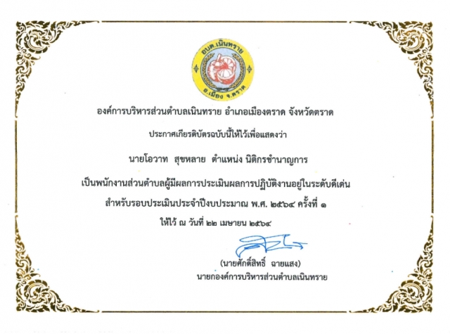 โครงการเชิดชูเกียรติพนักงานส่วนตำบลผู้มีผลการปฏิบัติงานดีเด่น ประจำปีงบประมาณ พ.ศ. 2564 ตามโครงการส่งเสริมคุณธรรมและจริยธรรม
