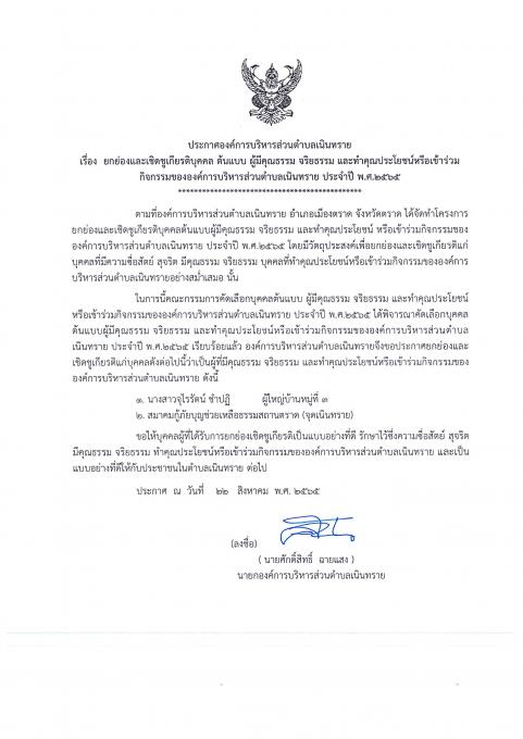 ประชาสัมพันธ์องค์การบริหารส่วนตำบลเนินทราย เรื่อง ขอประกาศยกย่องและเชิดชูเกียรติแก่บุคคลว่าเป็นผู้ที่มีคุณธรรม จริยธรรม และทำคุณประโยชน์หรือเข้าร่วมกิจกรรมขององค์การบริหารส่วนตำบลเนินทราย ประจำปี พ.ศ.2565