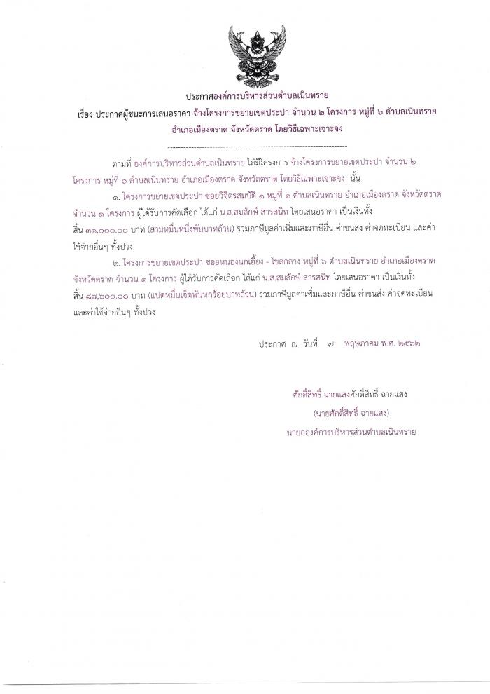 ประกาศผู้ชนะการเสนอราคา ประกาศองค์การบริหารส่วนตำบลเนินทราย เรื่อง ประกาศผู้ชนะการเสนอราคา จ้างโครงการขยายเขตประปา จำนวน ๒ โครงการ หมู่ที่ ๖ ต.เนินทราย อ.เมืองตราด จ.ตราด