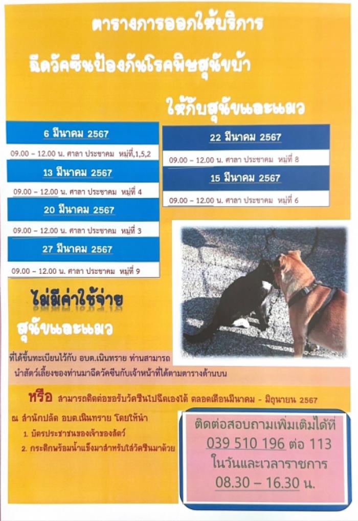 ประชาสัมพันธ์องค์การบริหารส่วนตำบลเนินทราย เรื่อง ตารางการออกให้บริการฉีดวัคซีนป้องกันโรคพิษสุนัขบ้าให้กับสุนัขและแมว ประจำปี 2567