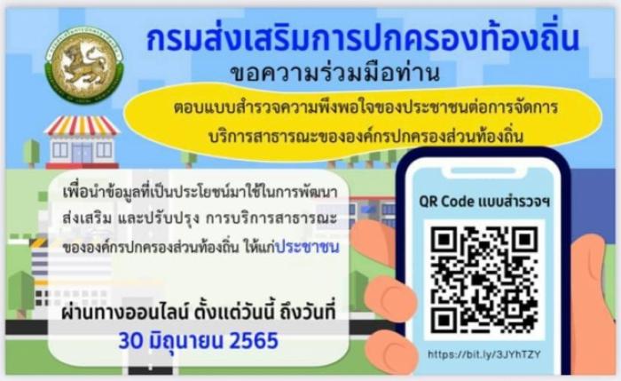 ด้วยกรมส่งเสริมการปกครองส่วนท้องถิ่น แจ้งขอความร่วมมือประชาชนในการตอบแบบสำรวจความพึงพอใจของท่านต่อการจัดการบริการสาธารณะของท้องถิ่น เพื่อนำข้อมูลที่เป็นประโยชน์มาใช้ในการพัฒนา ปรับปรุง การบริการสาธารณะของประชาชนต่อไป เพียงท่านสแกน QR Code แบบสำรวจฯ และดำเนินการประเมินความพึงพอใจ ได้ตั้งแต่วันนี้ ถึง 30 มิถุนายน 25652 มิ.ย. 2565 ตามลิงค์ที่แนบนี้ https://forms.gle/FUvkHvVagDcBqxV28