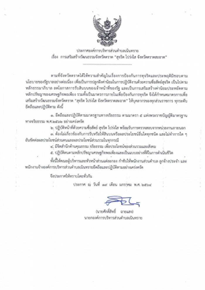ข่าวประชาสัมพันธ์ ประชาสัมพันธ์ ประกาศองค์การบริหารส่วนตำบลเนินทราย เรื่องการเสริมสร้างวัฒนธรรมจังหวัดตราด "สุจริต โปร่งใส จังหวัดตราดใสสะอาด 2564"